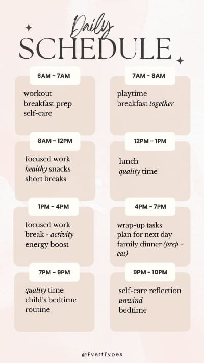 This schedule balances structured work time with meaningful moments for wellness, self-care, and bonding with your child. Adjust as needed to fit your unique pace and priorities!